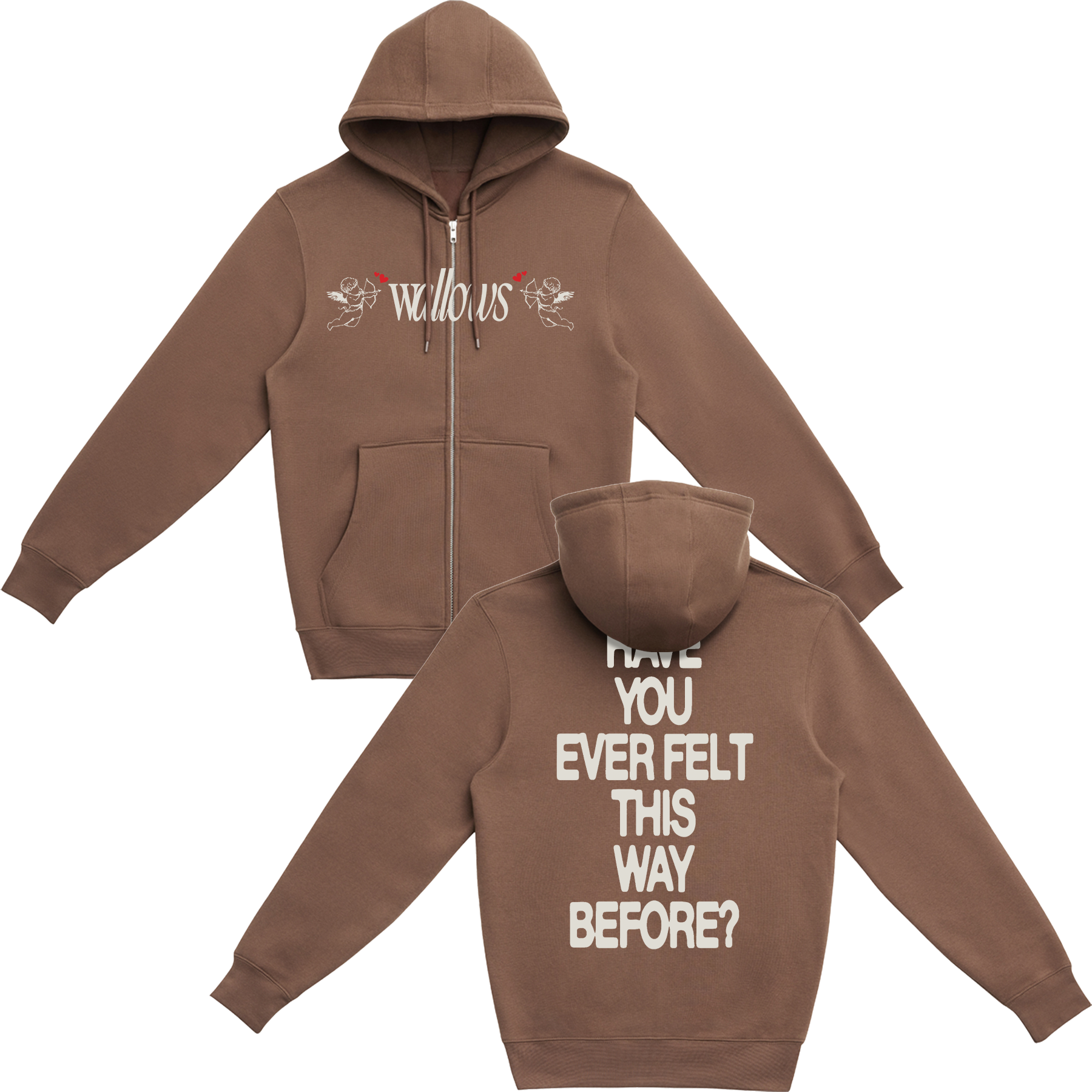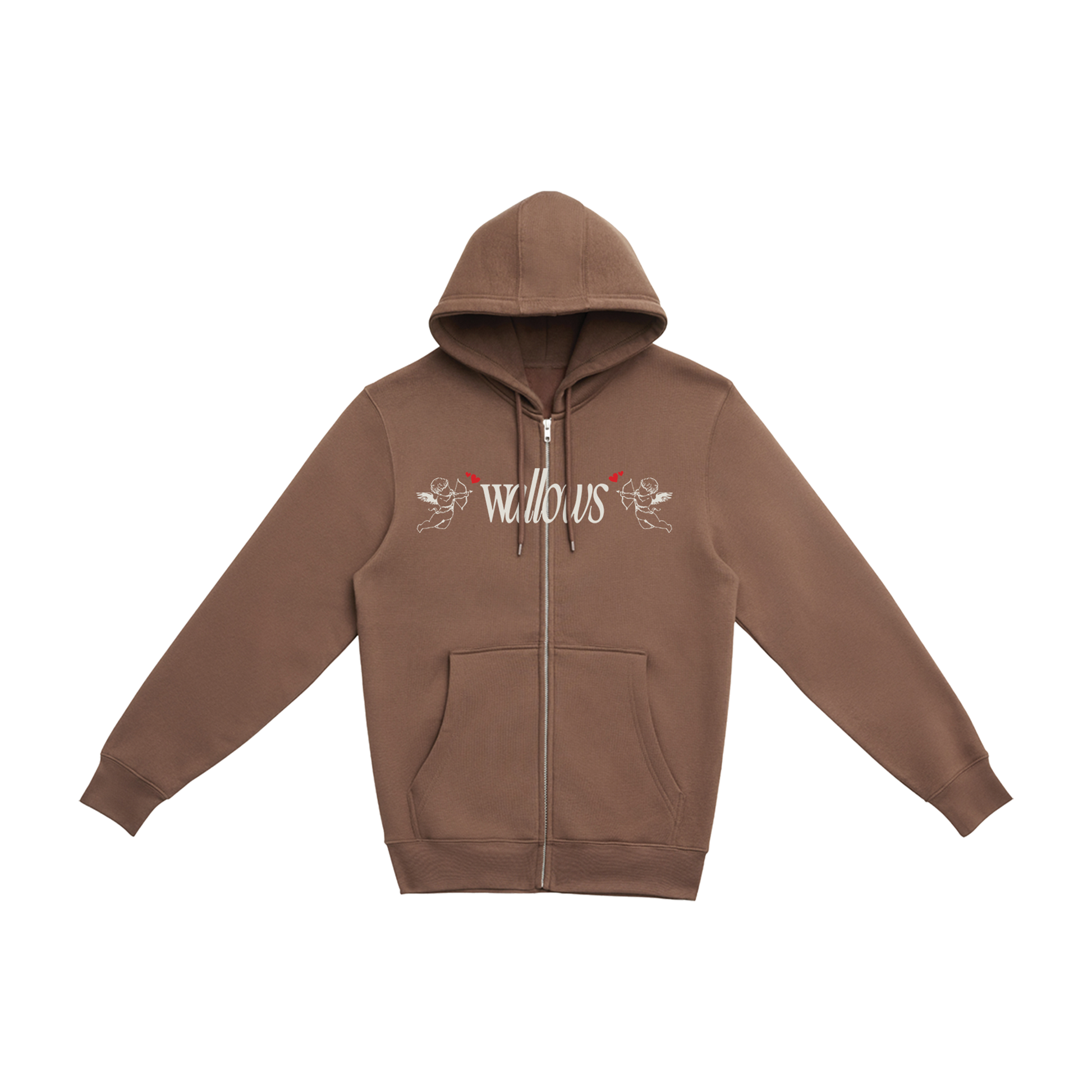 "Angel" graphic on front + lyrics from "Learn to Love Again" on the back of a 80/20 cotton/polyester Chestnut colored zip-up hoodie.