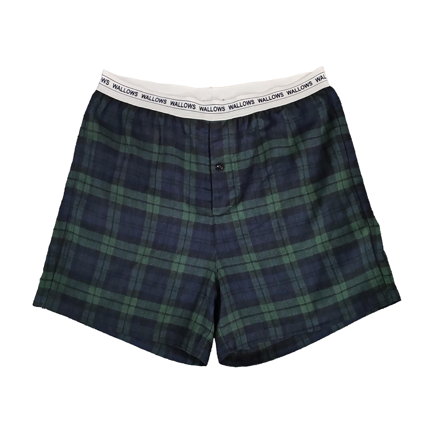 100% cotton flannel boxers with a custom woven waistband featuring Wallows logo. Button fly closure at front.